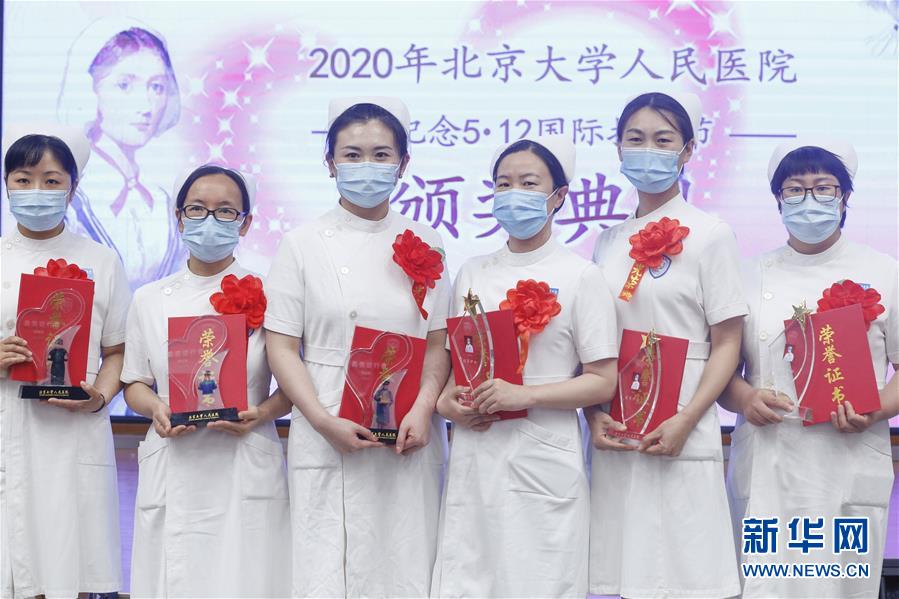 5月11日,獲獎護士在護士節(jié)活動上合影。在國際護士節(jié)到來之際,北京大學(xué)人民醫(yī)院11日舉辦慶祝護士節(jié)暨優(yōu)秀集體和個人表彰活動,并邀請援鄂醫(yī)療隊護士代表分享戰(zhàn)“疫”故事。我國今年護士節(jié)的主題為“致敬護士隊伍,攜手戰(zhàn)勝疫情”。新華社記者張玉薇攝