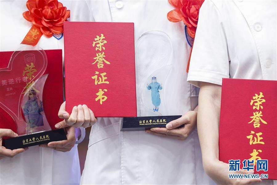 5月11日,獲獎護士在護士節(jié)活動上手捧獎杯和證書。在國際護士節(jié)到來之際,北京大學(xué)人民醫(yī)院11日舉辦慶祝護士節(jié)暨優(yōu)秀集體和個人表彰活動,并邀請援鄂醫(yī)療隊護士代表分享戰(zhàn)“疫”故事。我國今年護士節(jié)的主題為“致敬護士隊伍,攜手戰(zhàn)勝疫情”。新華社記者張玉薇攝