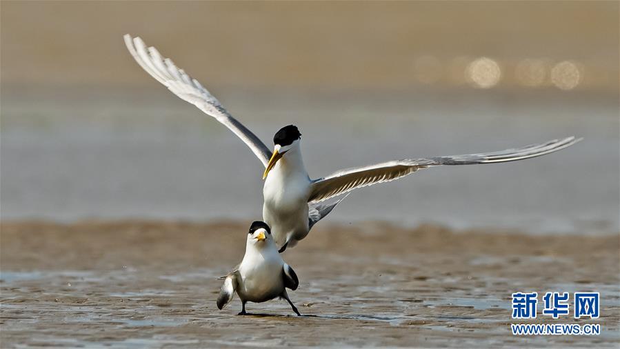眼下正是大鳳頭燕鷗繁育的時節(jié),在福建閩江河口濕地核心區(qū)鱔魚灘的沙洲上,大鳳頭燕鷗正相互嬉戲(5月9日攝)。新華社記者梅永存攝