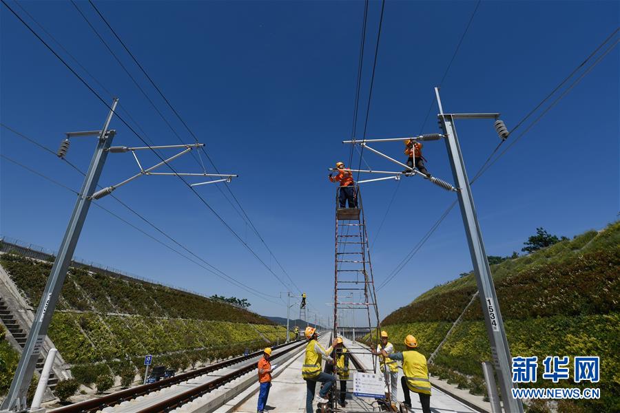 5月12日,中國鐵路上海局集團(tuán)公司上海高鐵維修段的技術(shù)人員在商合杭高鐵浙江湖州段調(diào)整接觸網(wǎng)導(dǎo)線。近日,商合杭高鐵合肥至湖州段聯(lián)調(diào)聯(lián)試正有條不紊進(jìn)行中。中國鐵路上海局集團(tuán)公司上海高鐵維修段抽調(diào)49名精兵強(qiáng)將,持續(xù)對管轄范圍內(nèi)的高鐵線路、信號、接觸網(wǎng)線進(jìn)行調(diào)試,為下一階段打下基礎(chǔ)。據(jù)了解,商合杭高鐵合湖段聯(lián)調(diào)聯(lián)試之后將轉(zhuǎn)入運(yùn)行試驗階段,驗收合格并通過安全評估后,力爭6月底具備開通運(yùn)營條件。新華社記者黃宗治攝