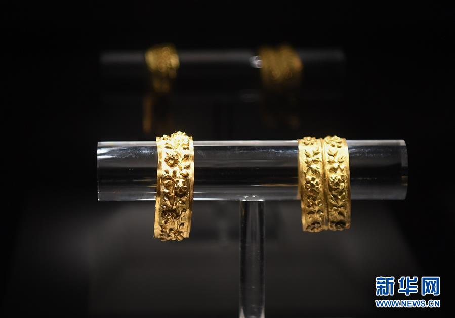 這是在廣東陽江海陵島的廣東海上絲綢之路博物館展出的“南海I號(hào)”出土文物金鉗鐲(5月12日攝)。新華社記者鄧華攝