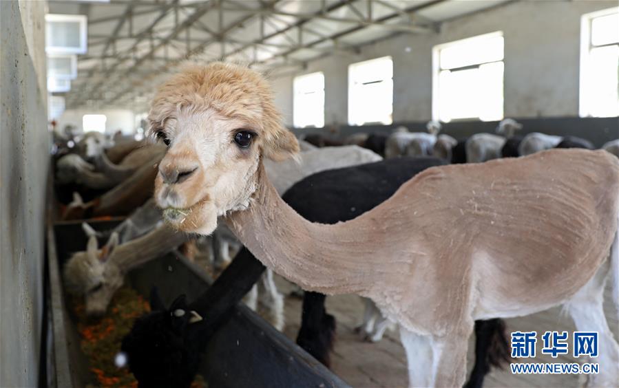 5月12日,剪下絨毛的羊駝在養(yǎng)殖基地的飼養(yǎng)舍里。新華社記者姚劍鋒攝