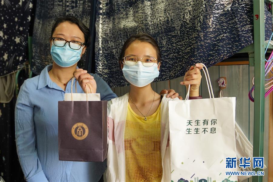 5月15日,在西南大學(xué)女生宿舍內(nèi),一名學(xué)生(右)展示學(xué)校和學(xué)院送來的裝有口罩、防疫指南的紙袋。當(dāng)日,重慶西南大學(xué)迎來疫情以來首批返校大學(xué)生。據(jù)介紹,按照疫情防控的需要,重慶市高校2020年春季學(xué)期從5月11日起按照“一校一策”原則,實(shí)行錯峰錯時分批次有序開學(xué)復(fù)課。新華社記者劉潺攝