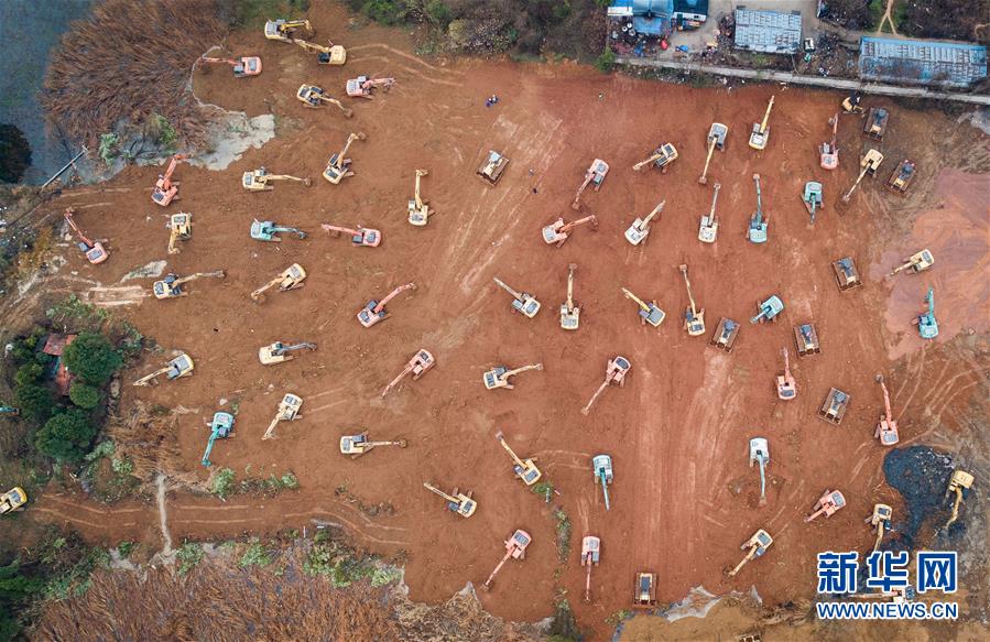 大型機械在武漢火神山醫(yī)院建設(shè)工地施工(1月24日攝,無人機照片)。新華社記者肖藝九攝
