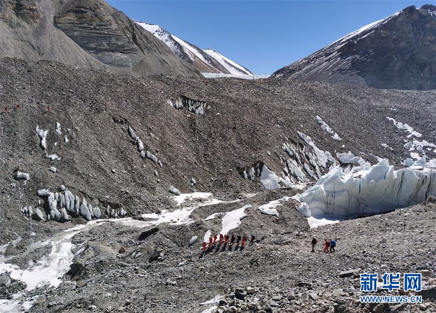 2020珠峰高程測量登山隊在前往海拔6500米的前進營地途中(5月17日攝)。5月17日11時左右,2020珠峰高程測量登山隊從海拔5800米的過渡營地出發(fā),用時近5個小時,到達海拔6500米的珠峰前進營地。據(jù)2020珠峰高程測量登山隊隊長次落介紹,5月18日,隊伍將在前進營地進行休整,并將對人員進行分工,計劃成立沖頂組、支援組、接應(yīng)組,召開沖頂前的分工會議和動員大會。新華社特約記者拉巴攝