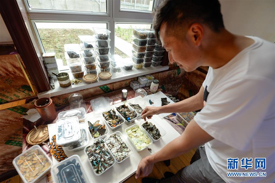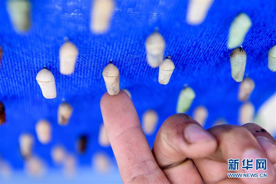 在吉木薩爾縣七彩蝶園,關(guān)富云在制作蝴蝶標(biāo)本(5月15日攝)。走進(jìn)關(guān)富云的七彩蝶園,游客不僅可以近距離接觸翩翩起舞的蝴蝶,還可以欣賞蝴蝶破繭成蝶的蛻變過程。今年34歲的關(guān)富云用9年的時間實(shí)現(xiàn)了自己的“蝴蝶夢”,完成美麗的“蝶變”。關(guān)富云家住新疆吉木薩爾縣北地社區(qū)。2011年,他看到一檔農(nóng)業(yè)致富節(jié)目,萌生了養(yǎng)殖蝴蝶的想法。關(guān)富云說,當(dāng)時蝴蝶養(yǎng)殖還是一種新興產(chǎn)業(yè),他抱著試一試的想法,在海南學(xué)習(xí)了3個月蝴蝶養(yǎng)殖,帶回100多個蝶蛹在家試驗(yàn)養(yǎng)殖。蝴蝶的生存周期短,在當(dāng)?shù)仞B(yǎng)殖需要克服溫度、濕度、病蟲害等問題。關(guān)富云不斷嘗試,越挫越勇,羽化成功的蝴蝶在2014年終于突破了萬只。蝴蝶的色彩艷麗,活體蝴蝶可用于婚慶、開業(yè)慶典等活動中放飛,可以取得很好的收益。但它的生命短暫,如何才能最大化蝴蝶的效益,留住它的美呢?關(guān)富云動起了心思,開始嘗試制作標(biāo)本和蝶翅畫?!昂宛B(yǎng)殖不同,做蝶翅畫是個創(chuàng)作的過程,從選擇標(biāo)本到粘貼,每一步都要突出美感。”關(guān)富云介紹,一幅色彩明艷、栩栩如生的蝶翅畫耗時多日才能完成。如今,關(guān)富云的活體蝴蝶和蝶翅畫通過線上線下銷售,產(chǎn)品還銷往北京、廈門等地。關(guān)富云的蝴蝶產(chǎn)品得到市場的認(rèn)可,政府也對他給予大力支持。2019年,吉木薩爾縣在泉子街鎮(zhèn)建起蝴蝶觀賞園,吸引了不少游客到此參觀游玩。對于未來的發(fā)展,關(guān)富云信心滿滿,“我希望把蝴蝶產(chǎn)業(yè)發(fā)展到天山南北,讓人們在寒冷的冬季也能觀賞到蝴蝶,并且讓更多人參與其中,致富脫貧”。新華社記者丁磊攝