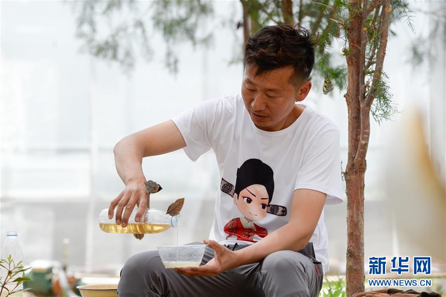 在吉木薩爾縣七彩蝶園,關(guān)富云查看蝶蛹生長狀況(5月15日攝)。新華社記者丁磊攝