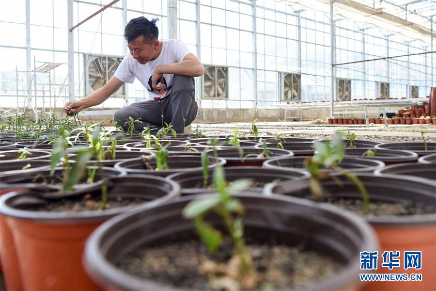 在吉木薩爾縣七彩蝶園,關(guān)富云在查看蝴蝶幼蟲的寄主植物生長情況(5月15日攝)。新華社記者丁磊攝
