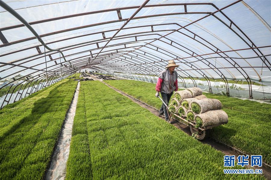 5月24日,盤錦市大洼區(qū)的農民在育苗棚內搬運符合插秧標準的水稻秧苗。新華社記者潘昱龍攝