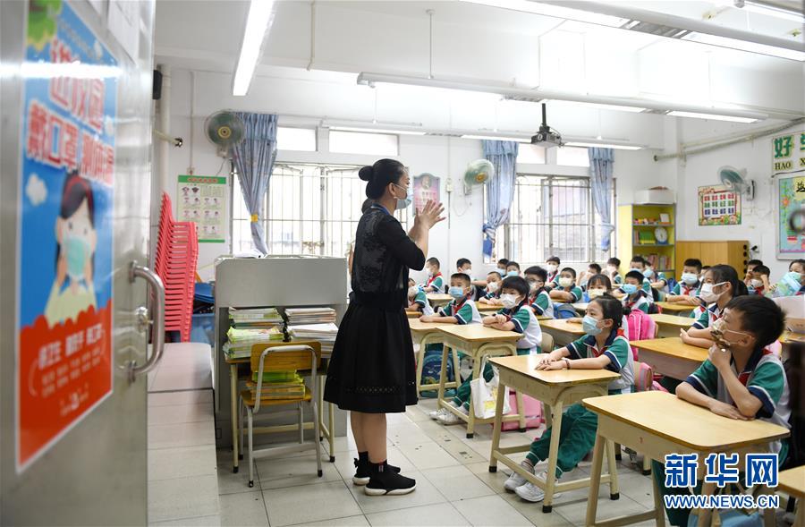 5月25日,廣州市荔灣區(qū)蔣光鼐紀念小學(xué)的老師在教學(xué)生防疫知識。當(dāng)日,廣州市各小學(xué)一至三年級學(xué)生正式開學(xué)復(fù)課。至此,廣州市中小學(xué)各年級已全部開學(xué)復(fù)課。新華社記者盧漢欣攝