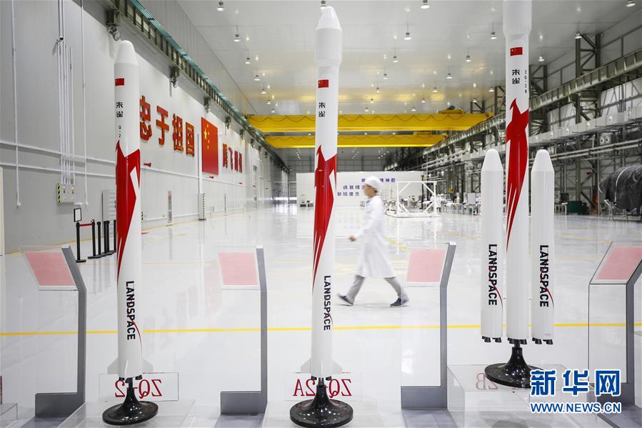 5月26日,工作人員走過(guò)藍(lán)箭航天智能制造基地發(fā)動(dòng)機(jī)裝配區(qū)內(nèi)的火箭模型。新華社記者張玉薇攝