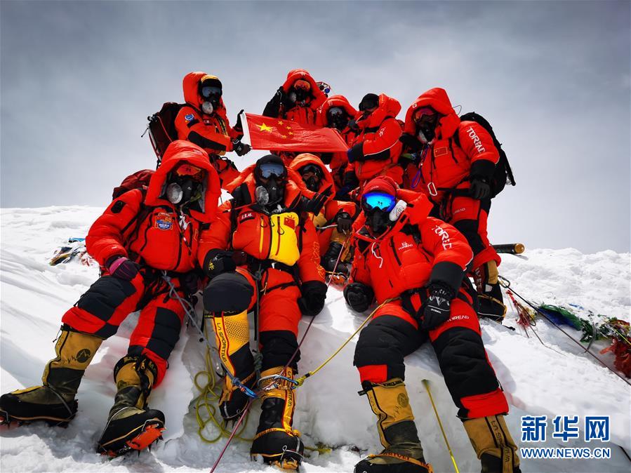 5月27日,2020珠峰高程測量登山隊在峰頂合影留念。