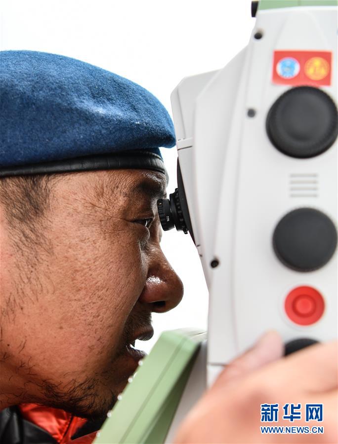 自然資源部第一大地測量隊隊員鄭林在使用全站儀對珠峰峰頂進(jìn)行交會觀測(5月27日攝)。新華社記者晉美多吉攝