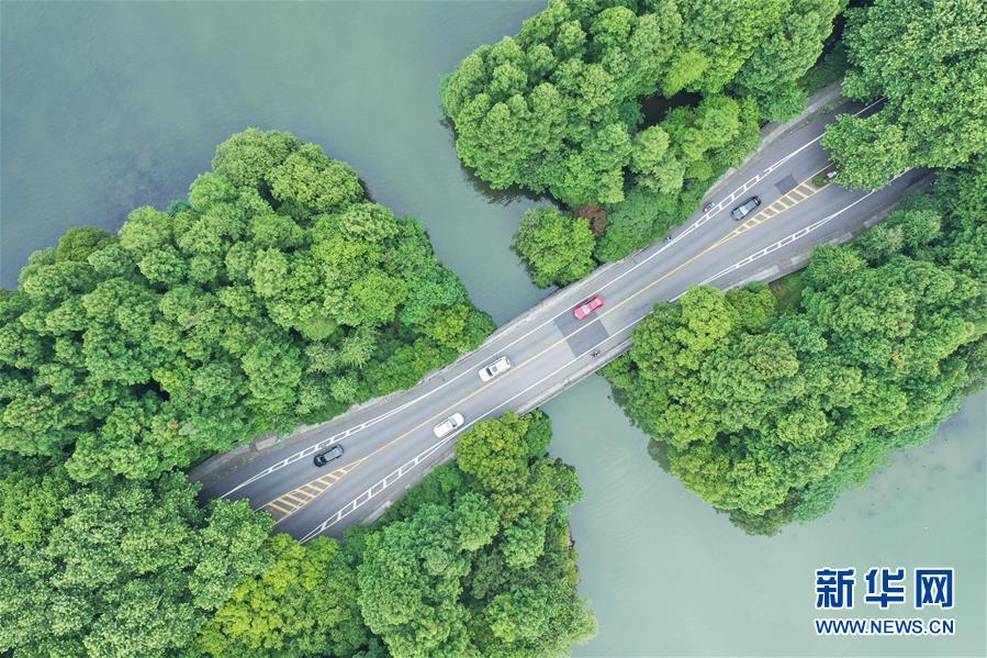 5月27日,車輛行駛在西湖楊公堤上(無人機照片)。隨著氣溫升高,杭州西湖綠意蔥蘢,展現(xiàn)出柔美的湖光山色。新華社記者翁忻旸攝
