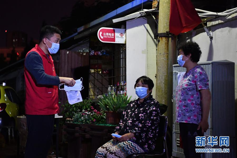 楊龍明在小區(qū)內(nèi)給住戶(hù)發(fā)放口罩(6月1日攝)。新華社記者李然攝。