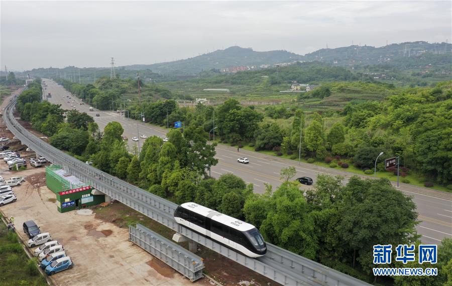 6月3日,一臺(tái)“云巴”在專用運(yùn)行軌道上進(jìn)行調(diào)試(無人機(jī)照片)。近日,重慶市首條“云巴”示范線項(xiàng)目在重慶璧山區(qū)正式亮相。此次發(fā)布的“云巴”采用電能驅(qū)動(dòng),具有轉(zhuǎn)彎半徑小、爬坡能力強(qiáng)、噪音低、安全性高、建設(shè)成本低、建造周期短等優(yōu)勢,能為乘客提供更智能、舒適、便捷的出行體驗(yàn)。據(jù)介紹,璧山區(qū)“云巴”示范線項(xiàng)目自2019年8月開建,線路正線全長15.4km,共設(shè)車站15座,預(yù)計(jì)2020年9月全線通車。新華社記者劉潺攝。