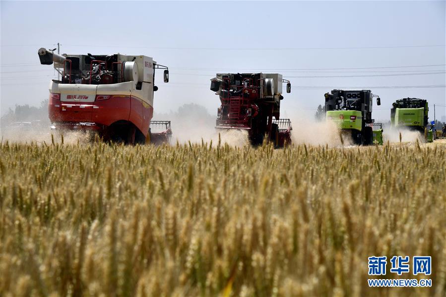 6月3日,收割機(jī)在汶上縣郭倉鎮(zhèn)的麥田里收獲小麥。目前,我國第二大小麥主產(chǎn)區(qū)山東6000多萬畝小麥進(jìn)入收獲階段。農(nóng)民們搶抓有利天氣,自南向北陸續(xù)開鐮。新華社記者郭緒雷攝。