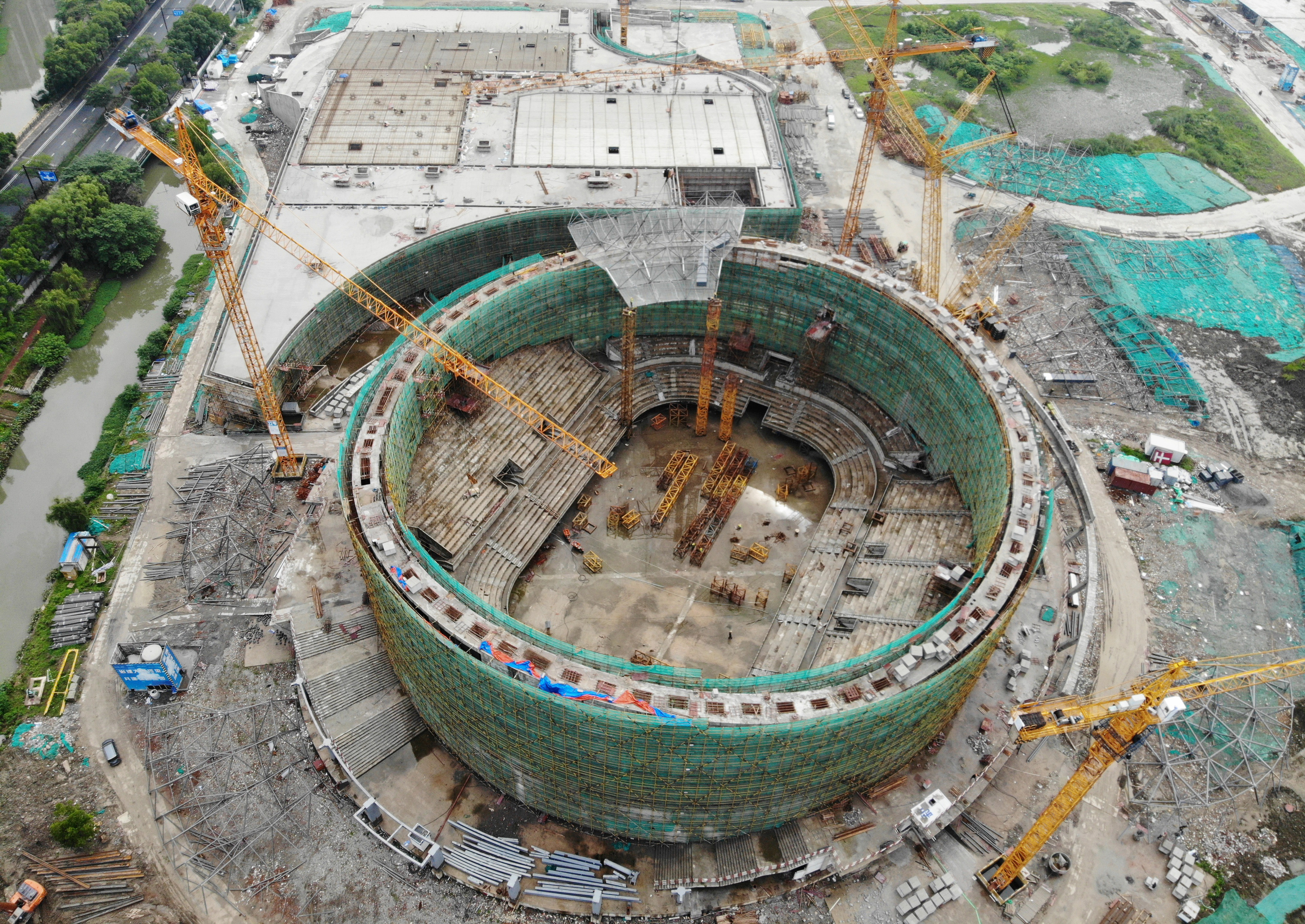2020年6月9日,從空中俯瞰正在建設(shè)中的杭州亞運會乒乓球館。近日,位于杭州運河亞運公園內(nèi)的乒乓球館主體結(jié)構(gòu)完工,開始進入自支撐鋼斜肋系統(tǒng)玻璃立面安裝階段。據(jù)了解,杭州亞運會乒乓球館占地1.94萬平方米,將建成12片標(biāo)準(zhǔn)乒乓球場地,并可容納5000-6500位觀眾。該乒乓球館設(shè)計靈感來源于杭州良渚文化中的“玉文化”,采用了“琮”的樣子。