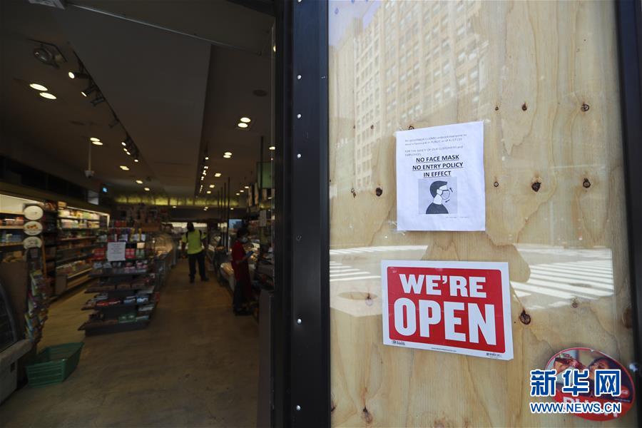 6月8日,美國紐約一家商店的門口貼著佩戴口罩方可進入的提示。在因新冠疫情進入“居家令”近三個月之后,美國紐約市于當地時間8日開始“解封”,進入經濟重啟的第一階段。新華社記者王迎攝