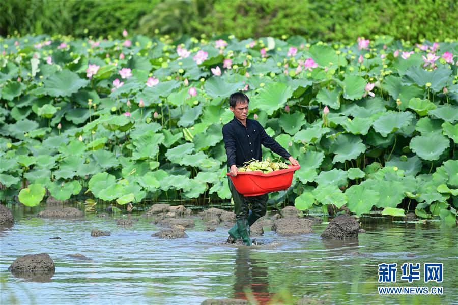6月9日,村民在??邶埲A區(qū)龍泉鎮(zhèn)椰子頭村搬運(yùn)采摘的蓮蓬。初夏時(shí)節(jié),位于海南??邶埲A區(qū)龍泉鎮(zhèn)的蓮蓬逐漸成熟,當(dāng)?shù)卮迕窦泳o采摘,一派繁忙景象。新華社記者蒲曉旭攝