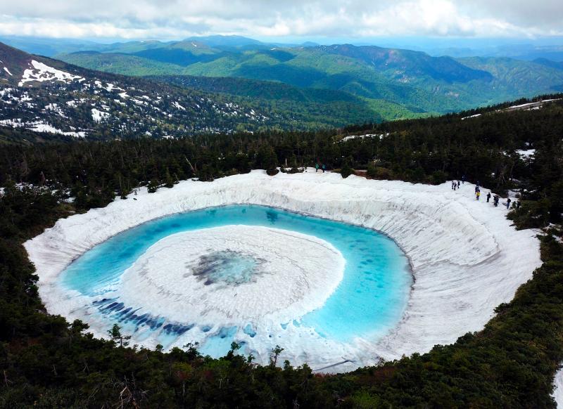 當?shù)貢r間2020年6月8日,日本,在橫跨巖手縣與秋田縣的八幡平山頂附近的“鏡沼”,伴隨著“鏡沼”的積雪從外側逐漸融化,外圍的碧藍色湖水與中心部的潔白積雪相映成趣,呈現(xiàn)出獨特的類似“龍眼”的景象。據(jù)悉,八幡平“龍眼”奇景只在每年5月下旬至6月初的雪融期間短暫出現(xiàn)。