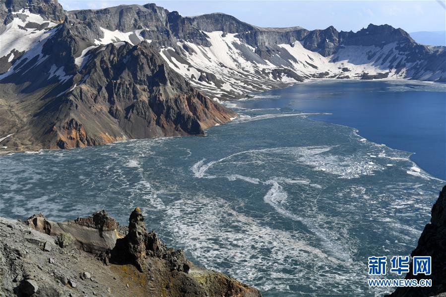 這是6月12日拍攝的長(zhǎng)白山天池。近日,長(zhǎng)白山天池冰層逐漸消融,迎來(lái)“開(kāi)冰季”。新華社記者 林宏 攝