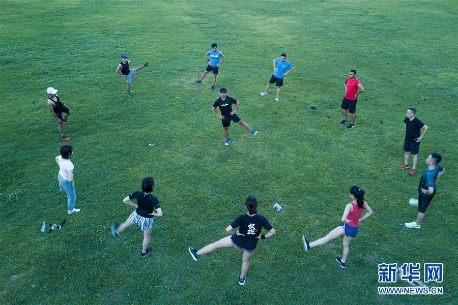 6月11日傍晚,在??谌f綠園,市民在夜跑前做熱身運動(無人機拍攝)。近年來,夜跑成為越來越多都市人熱衷的健身方式之一。在海南??冢慨斠鼓唤蹬R,“夜跑族”來到海口萬綠園、世紀公園等夜跑場所跑步,用一身酣暢淋漓的汗水擺脫白天工作中的壓力,享受跑步帶來的歡愉。新華社記者 蒲曉旭 攝