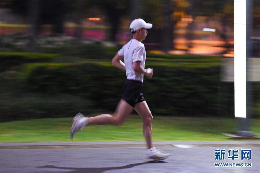 一位市民在??谌f綠園夜跑(5月28日拍攝)。近年來,夜跑成為越來越多都市人熱衷的健身方式之一。在海南海口,每當夜幕降臨,“夜跑族”來到海口萬綠園、世紀公園等夜跑場所跑步,用一身酣暢淋漓的汗水擺脫白天工作中的壓力,享受跑步帶來的歡愉。新華社記者 蒲曉旭 攝