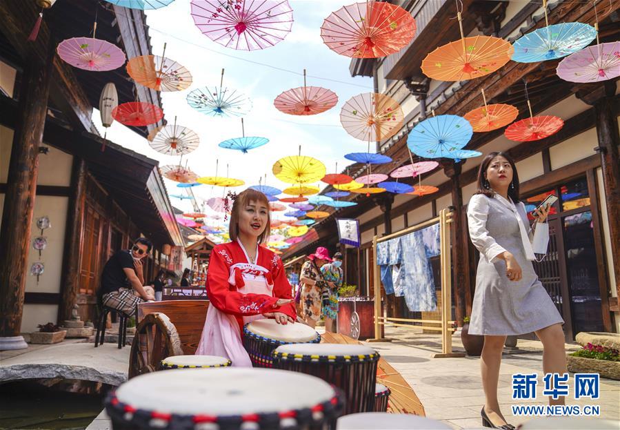 6月13日,在長春市世茂蓮花山小鎮(zhèn)寬厚里商街,一名古裝愛好者演奏手鼓。當(dāng)日是“文化和自然遺產(chǎn)日”。吉林長春首屆蓮花山消夏生活節(jié)在世茂蓮花山小鎮(zhèn)舉行。活動將非遺展示與假日消暑休閑相結(jié)合,讓游人在“古色古香”的油紙傘巷中品傳統(tǒng)文化魅力,享夏日休閑愜意。新華社記者許暢攝。