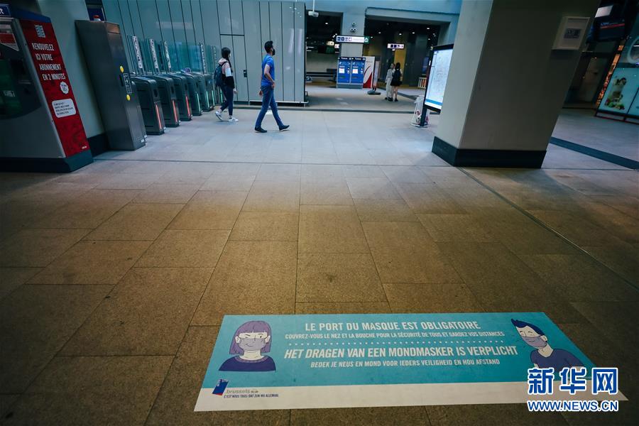 這是6月13日在比利時布魯塞爾一處地鐵站拍攝的提醒乘客佩戴口罩的提示牌。新華社記者 張鋮 攝
