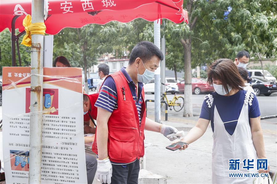 6月17日,一位工作人員在北京市西城區(qū)廣外街道小馬廠東社區(qū)的入口為居民測量體溫。新華社記者 張玉薇 攝