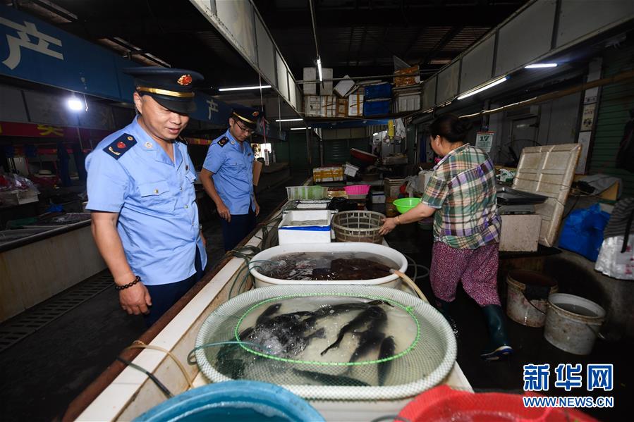 6月17日,市場(chǎng)監(jiān)管執(zhí)法人員在東林鎮(zhèn)農(nóng)貿(mào)市場(chǎng)開展專項(xiàng)執(zhí)法行動(dòng),檢查是否存在非法銷售野生動(dòng)物的情況。