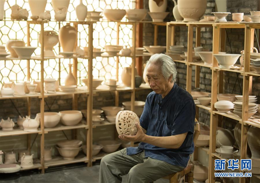 6月17日,在位于浙江慈溪的工作室,聞長(zhǎng)慶查看一件素?zé)蟮难瑺t蓋。新華社記者 翁忻旸 攝