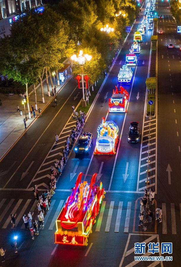 6月19日,花車在長春市人民大街上巡游(無人機(jī)照片)。新華社記者張楠攝