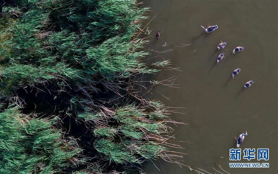 6月19日,一群鴨子在新疆烏倫古湖國家濕地公園覓食(無人機(jī)照片)。烏倫古湖國家濕地公園位于新疆阿勒泰地區(qū)福海縣城以西,由烏倫古湖和吉力湖兩部分組成。烏倫古湖濕地公園是遷徙候鳥飛越天山和阿爾泰山的“能量補(bǔ)充站”,良好的濕地生態(tài)吸引著大量遷徙鳥類在此集結(jié)成群,繁殖棲息,成為一道靚麗的風(fēng)景線。新華社記者 沙達(dá)提 攝