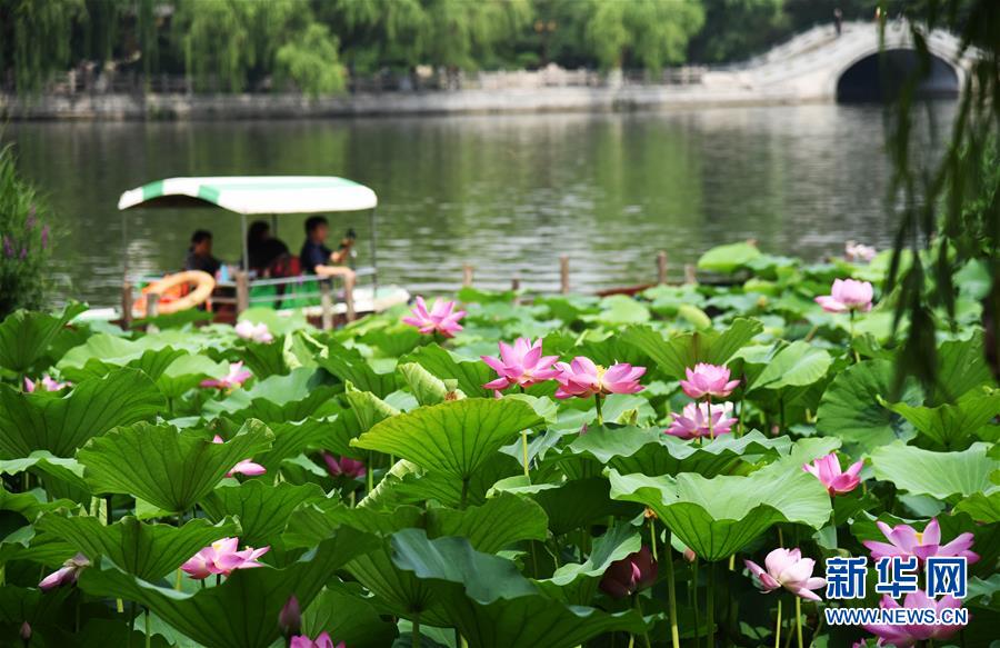 6月19日,市民在大明湖畔欣賞荷花。近日,山東濟(jì)南大明湖的荷花陸續(xù)綻放,吸引游客前來(lái)觀(guān)賞。新華社記者 王凱 攝