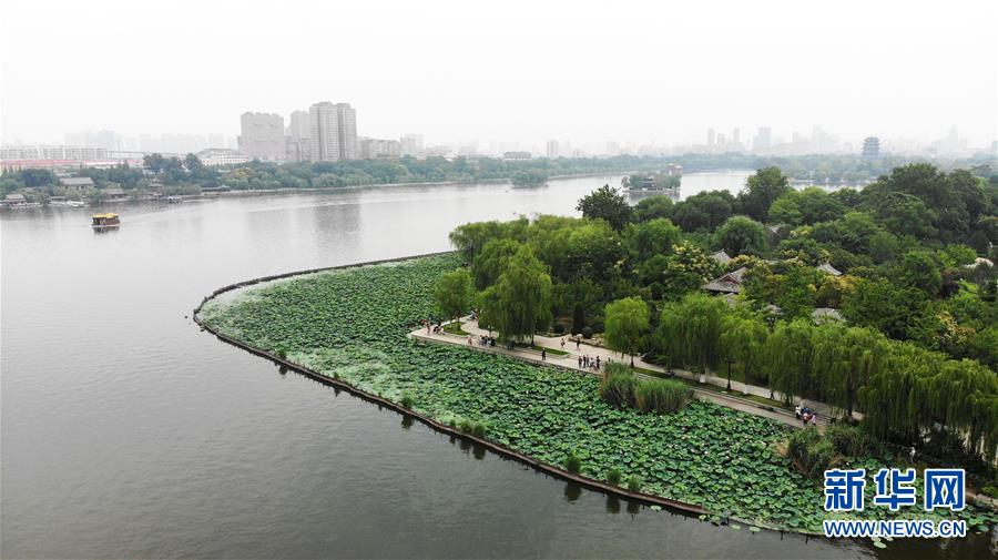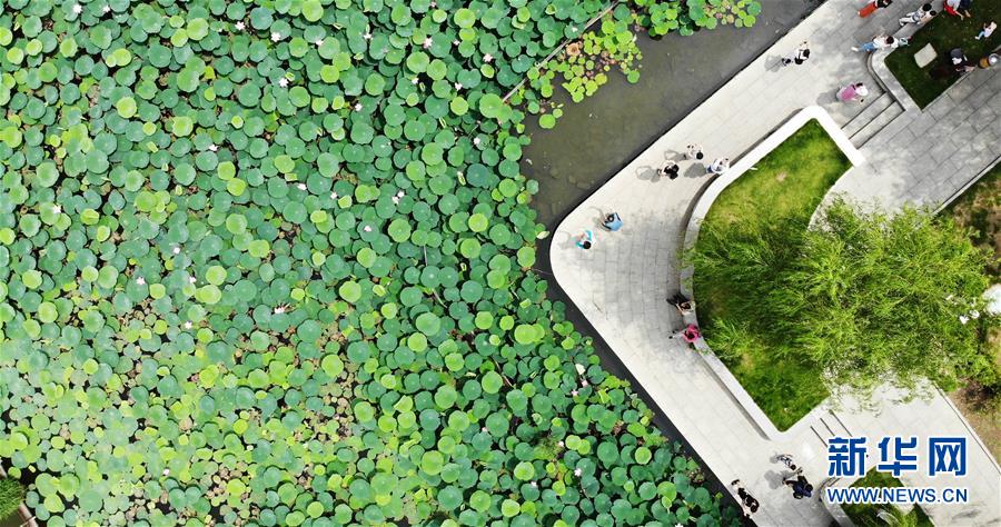 6月19日拍攝的大明湖畔的荷花池(無(wú)人機(jī)照片)。近日,山東濟(jì)南大明湖的荷花陸續(xù)綻放,吸引游客前來(lái)觀(guān)賞。新華社記者 王凱 攝