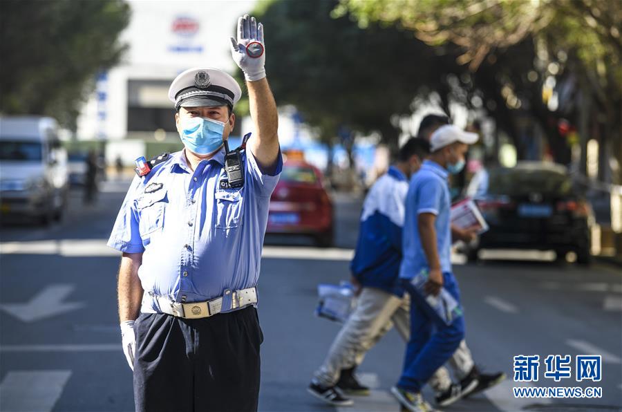 6月20日,在烏魯木齊市第二中學(xué)門前,烏魯木齊市公安局交警支隊天山區(qū)大隊新華路中隊警官艾力夏提·哈力木然提在指揮交通。當(dāng)日,烏魯木齊市初中升高中考試開始。為保障為期三天的中考順利進行,烏魯木齊市公安局交警支隊在各考點執(zhí)勤,為考生保駕護航新華社記者 王菲 攝