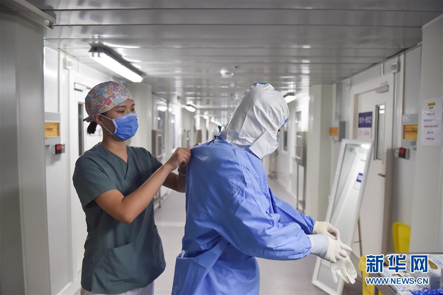 6月19日,在北京地壇醫(yī)院隔離病房外,兩位護士在幫同事穿防護服。新華社記者彭子洋攝