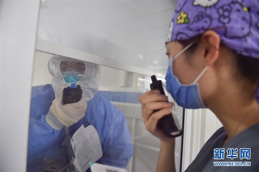 6月19日,在北京地壇醫(yī)院隔離病區(qū),一名來地壇醫(yī)院支援的護士(左)在跟地壇醫(yī)院的護士學(xué)習(xí)使用對講機。新華社記者彭子洋攝