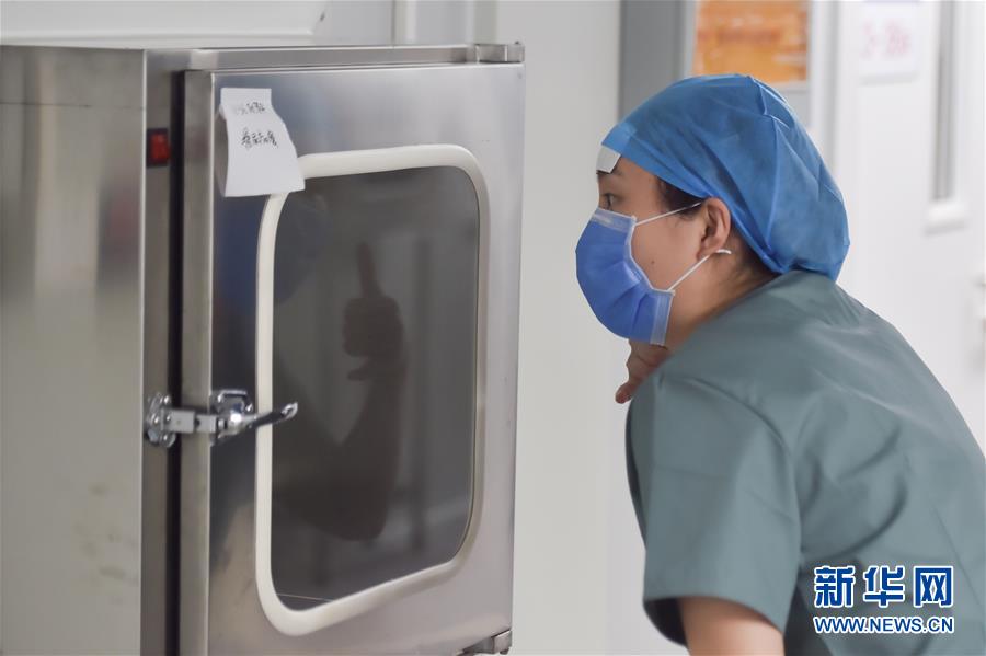 6月19日,在北京地壇醫(yī)院隔離病房外,護(hù)士和病人溝通,做著打電話的手勢。新華社記者彭子洋攝