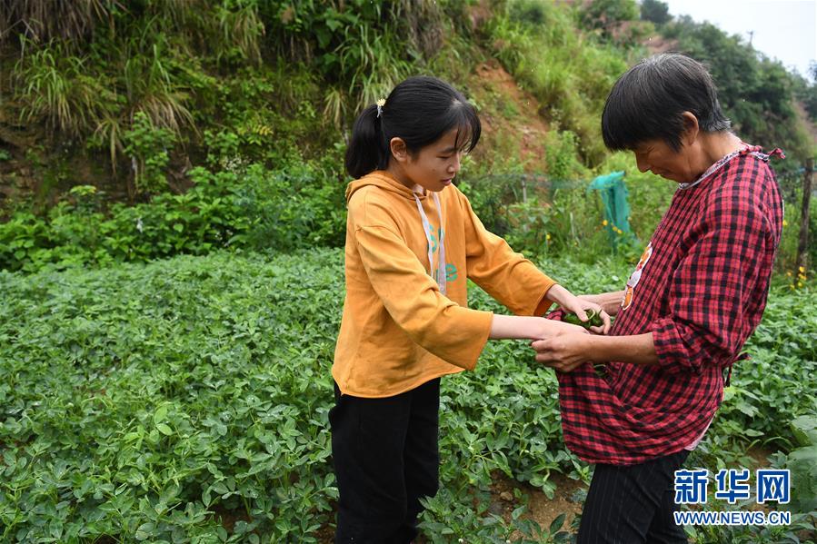 6月20日,蔡齊艷在菜園里幫媽媽傅紹秀采摘蔬菜。新華社記者劉軍喜攝