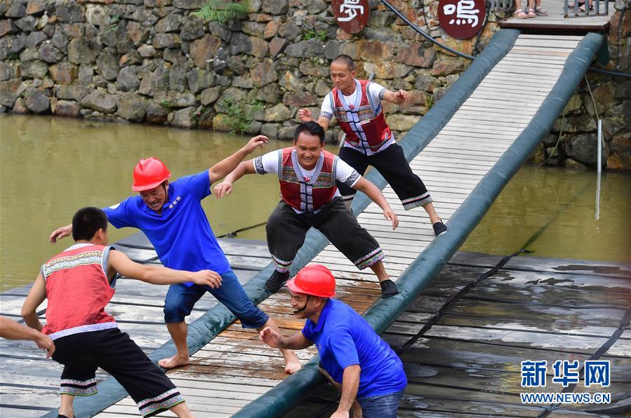 在廣西融水雙龍溝森林旅游度假區(qū)夢嗚苗寨,幾位搬遷戶協(xié)助游客挑戰(zhàn)“搖擺橋”(6月21日攝)。近年來,融水打造原生態(tài)苗族文化體驗園——夢嗚苗寨,讓搬遷進(jìn)城的貧困戶住進(jìn)復(fù)原建設(shè)的老房子。景區(qū)提供綠化保潔、游樂設(shè)施管理、民族歌舞表演等工作崗位,多渠道增加貧困戶收入。
