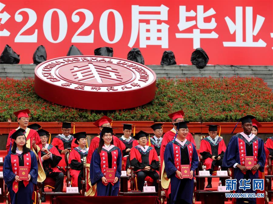 6月23日,在華東師范大學(xué)閔行校區(qū)的畢業(yè)典禮上,優(yōu)秀畢業(yè)生代表接受表彰。當(dāng)日,華東師范大學(xué)舉行2020屆畢業(yè)典禮。由于疫情防控需要,今年的典禮在兩個(gè)校區(qū)分別舉辦,并全程在線直播。約7700名華東師范大學(xué)2020屆畢業(yè)生通過(guò)現(xiàn)場(chǎng)或“云端”的方式參加畢業(yè)典禮。新華社記者劉穎攝