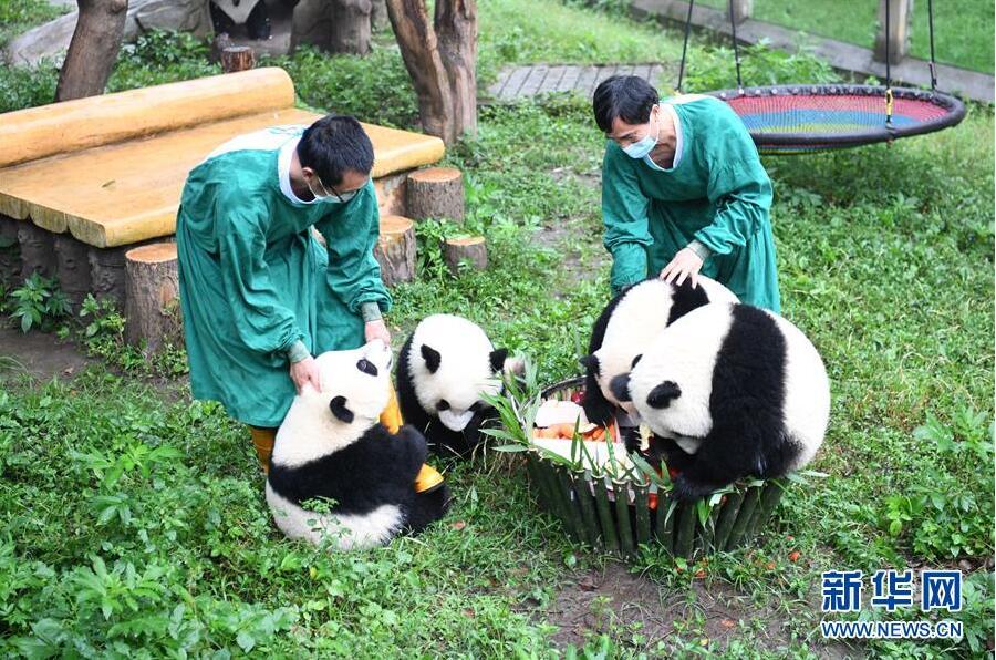 當(dāng)日,重慶動物園為4只大熊貓“雙雙”“重重”“喜喜”“慶慶”舉行周歲生日慶?;顒印?只大熊貓在重慶動物園熊貓館運動場內(nèi)玩耍嬉戲,享用市民游客為它們親手制作的“生日蛋糕”。
