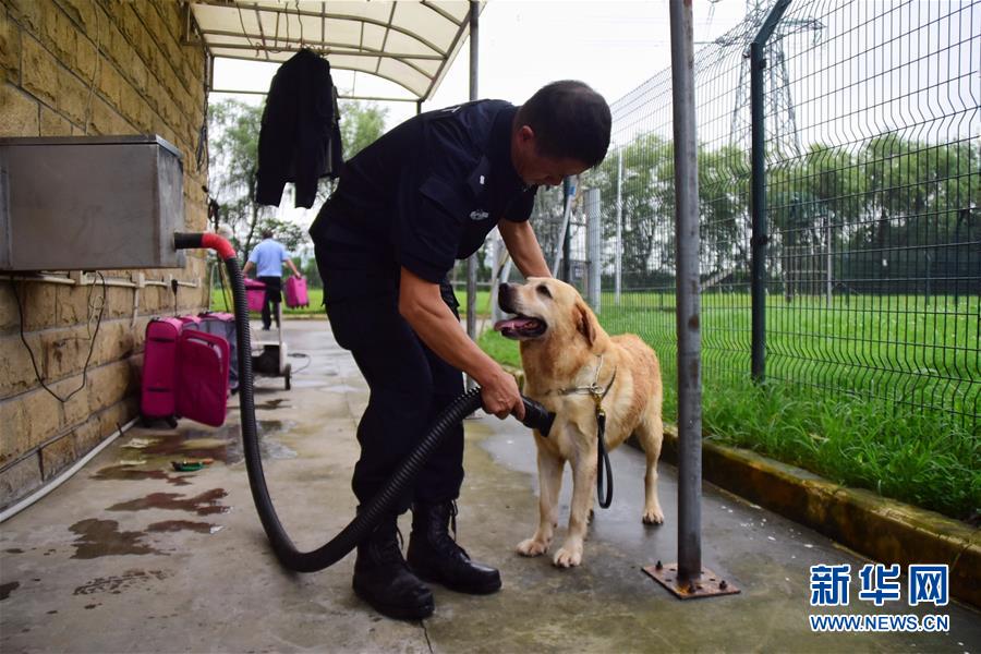 6月24日,緝毒犬“多多”洗澡后,訓(xùn)導(dǎo)員周吉榮將其毛發(fā)吹干。 新華社記者 鄭夢雨 攝