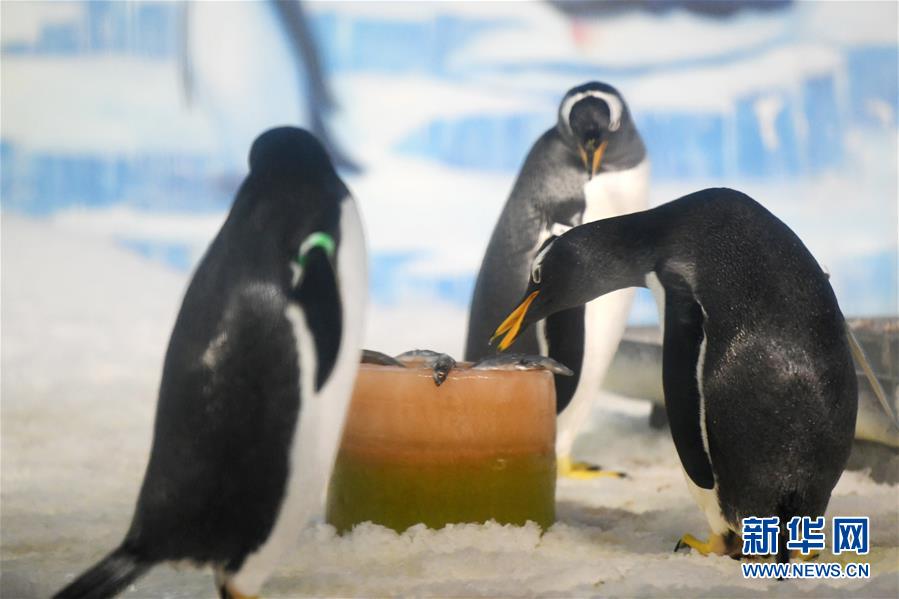 6月24日,哈爾濱極地館的企鵝在享用工作人員送來的美食。當(dāng)日,哈爾濱極地館的工作人員特地準(zhǔn)備了“魚粽”“肉粽”,讓生活在這里的極地動(dòng)物也品嘗一下端午美食。新華社記者王建威攝