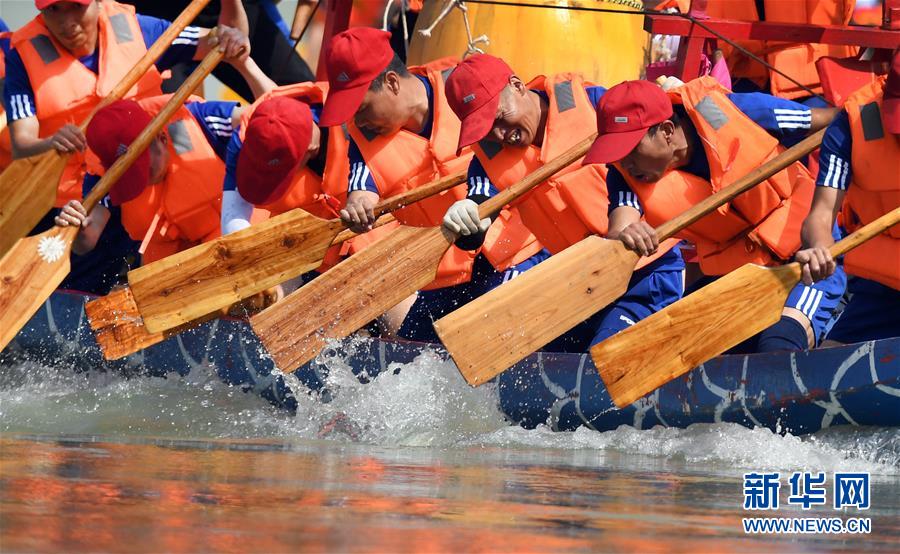 6月25日,參賽龍舟隊(duì)在比賽中。當(dāng)日是農(nóng)歷五月初五,是中國(guó)民間的傳統(tǒng)節(jié)日端午節(jié)。陜西省安康市第20屆龍舟節(jié)在漢江上舉行。每年端陽節(jié)前后,安康沿江一帶的縣區(qū)都舉行龍舟賽,賽龍舟成為民間自發(fā)的盛大活動(dòng)。新華社記者 陶明 攝