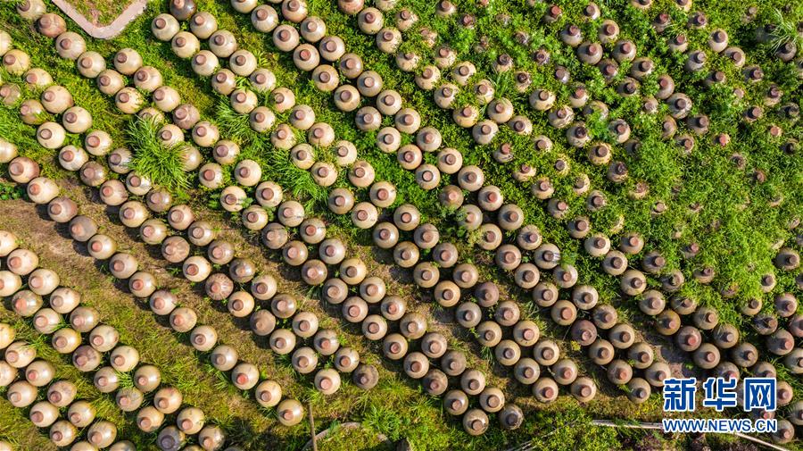赤水曾氏曬醋廠晾曬的醋壇(6月26日攝,無人機(jī)照片)。“赤水曬醋”采用固體發(fā)酵繁殖產(chǎn)生天然醋酸菌,醋醅和成品醋都在日光下曝曬而成,故稱曬醋?!俺嗨畷翊住敝谱鳉v史悠久,工序考究,2009年被列入貴州省級(jí)非遺名錄。新華社記者 陶亮 攝
