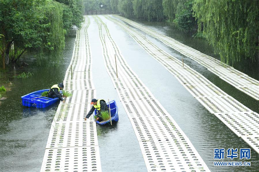 6月29日,工作人員在吳興區(qū)湖東街道的“水上稻田”插秧。今年以來,浙江湖州吳興區(qū)湖東街道開始在轄區(qū)河道大規(guī)模推廣“水上稻田”新型農(nóng)業(yè)項目,利用浮島進(jìn)行特種水稻種植,既能凈化水體,又能產(chǎn)出生態(tài)稻谷?!八系咎铩鳖A(yù)計在11月實現(xiàn)收割。新華社記者翁忻旸攝